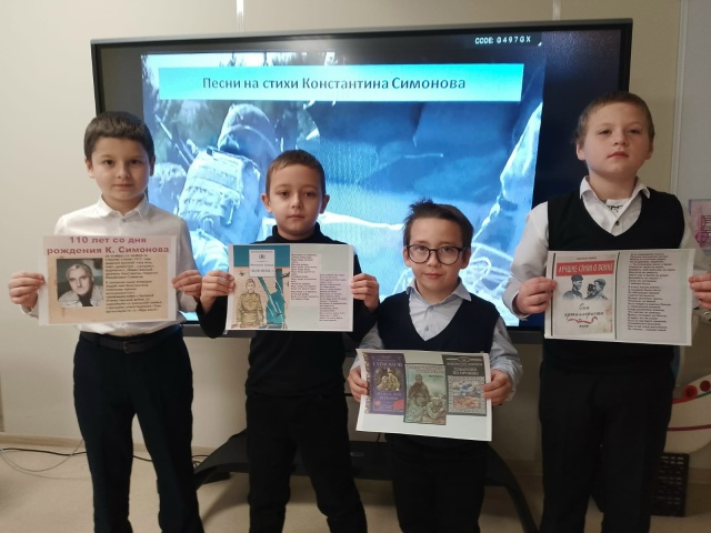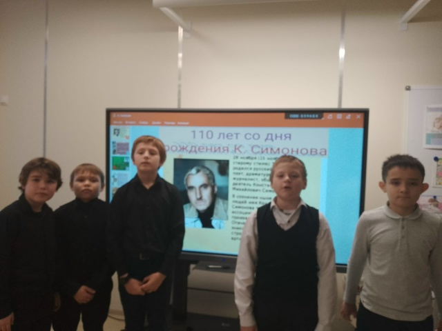 В библиотеке Белозерьевской школы прошла Литературно-музыкальная гостиная, посвящённая 110-летию поэту, писателю, драматурга, общественному деятелю, военному корреспонденту в годы ВОВ Константину Михайловичу Симонову. Учащиеся узнали о жизненном пути этого известного человека. Рассказ сопровождался яркой президентацией. Затем посмотрели видео, подготовленное педагогом-библиотекарем, с выразительным чтением впечатляющих стихов Константина Симонова, послушали песни на его стихи на фоне соответствующих иллюстраций на мониторе.